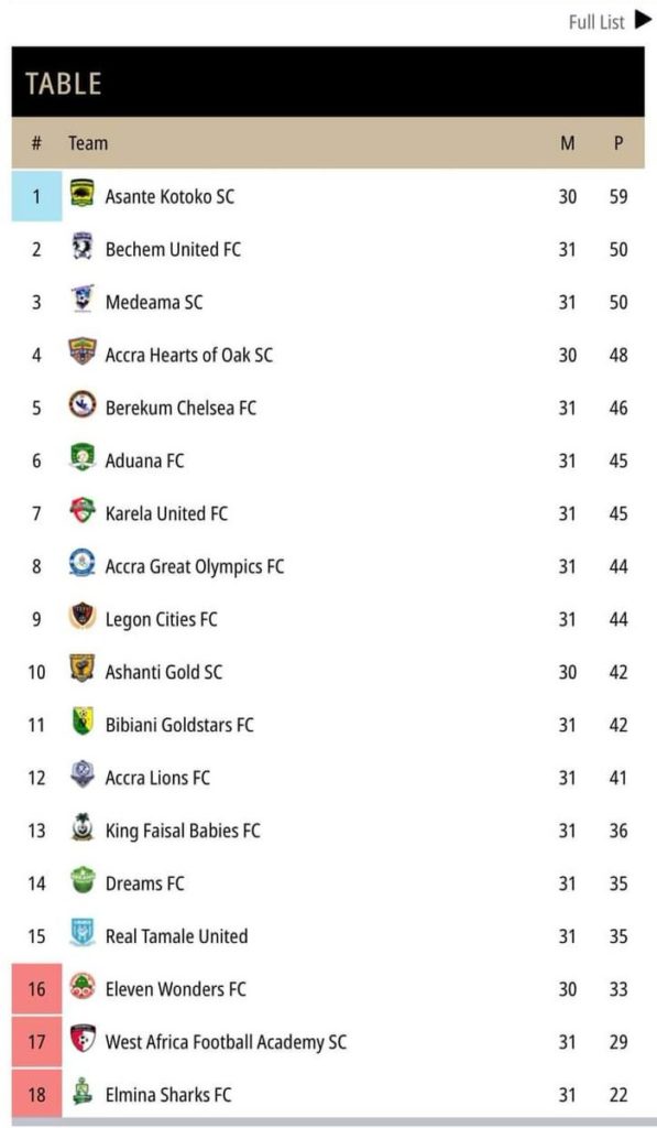 The victory means Kotoko have 59 points and hold a 9-point lead at the top over closest rivals Bechem United and Medeama. Fourth-placed Hearts of Oak trail Kotoko by 12 points.