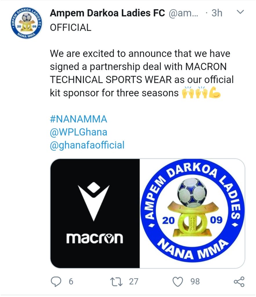 Ghana Women’s Premier League giants, Ampem Darkoa Ladies Football Club have announced a partnership deal with Macron Company Limited.