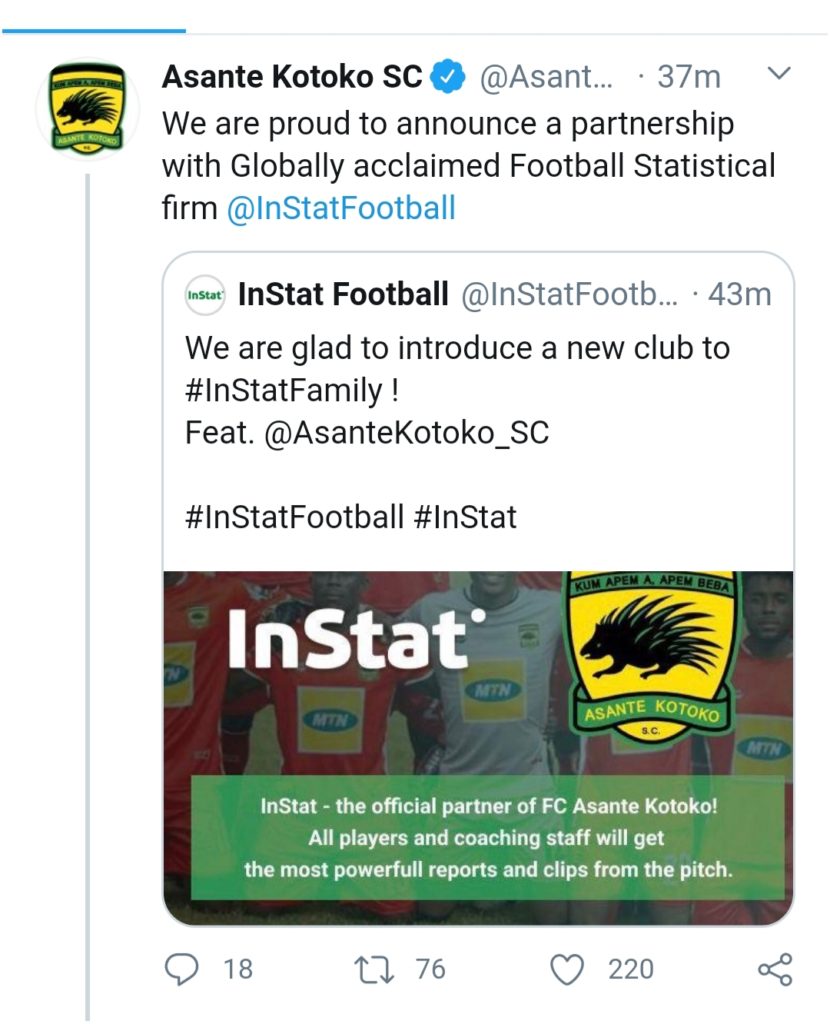 Ghanaian giants Asante Kotoko have announced a partnership deal with sports performance analysis company – InStat.