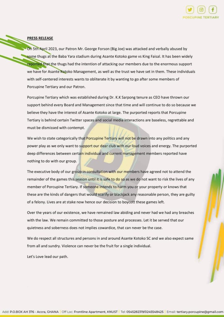 Porcupine Tertiary, the ever-present Asante Kotoko supporters wing, has decided to boycott the remaining Ghana Premier League matches.