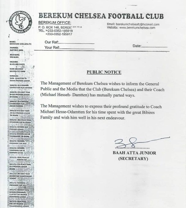 Ghana Premier League side Berekum Chelsea have parted ways with the head coach of the side Michael Hesse Oamtten.