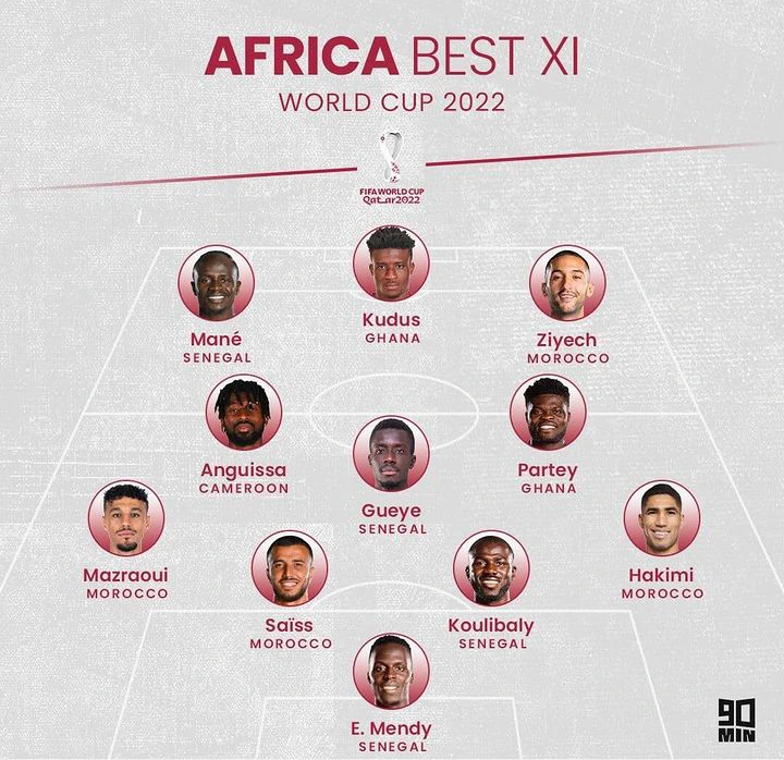 Sadio Mane and Hakim Ziyech are place as wingers in the team. Mohamed Kudus is placed as the striker in the Best XI African Players in the 2022 World Cup.