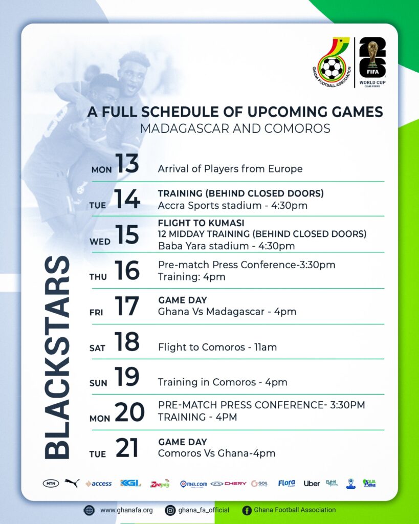 Ghana will square off with Madagascar in the first game at the Baba Yara Sports stadium on Friday, November 17 before traveling to Moroni for the second game against Comoros on Tuesday, November 21,2023.