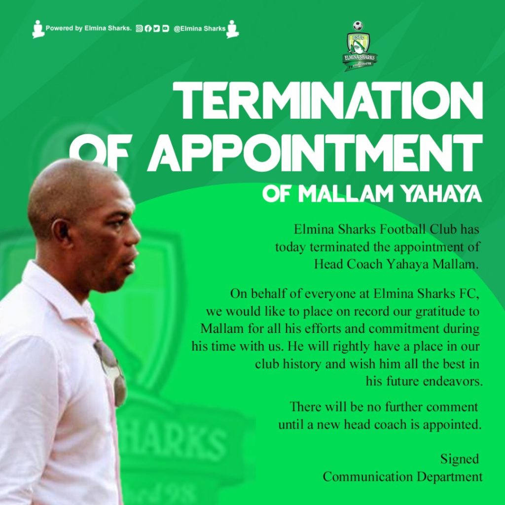 “Elmina Sharks have today terminated the appointment of head coach Mallam Yahaya,” wrote Elmina Sharks in a club release.