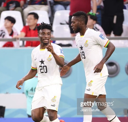 AL RAYYAN, QATAR - NOVEMBER 28: Mohammed Kudus of Ghana celebrates his goal with Inaki Williams of Ghana during the FIFA World Cup Qatar 2022 Group H match between Korea Republic and Ghana at Education City Stadium on November 28, 2022 in Al Rayyan, Qatar. (Photo by Jean Catuffe/Getty Images)