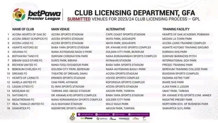 The Ghana Football Association (GFA) has confirmed that all eighteen Premier League clubs have successfully submitted their venues for the upcoming 2023/24 season.