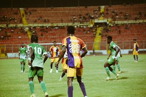 The game had a fast start, both sides in the opening 5 minutes came close to scoring. Goalkeeper Asiedu Benjamin pulled off a good save to deny Isaac Mensah from giving Hearts the lead and Baba Yahaya saw his ferocious effort from the edge of the box hit the post.