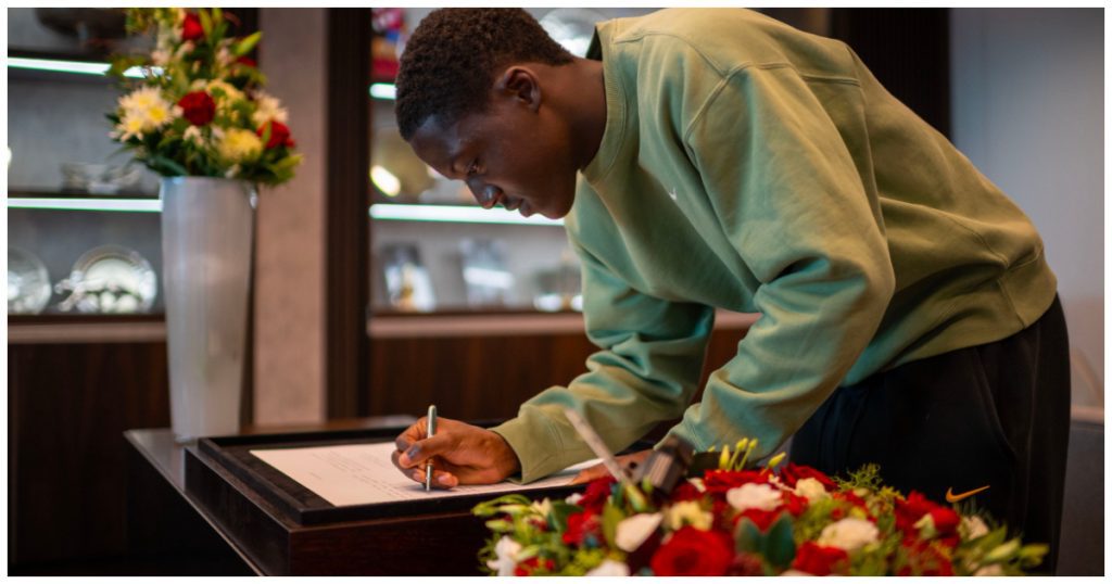 English-born Ghanaian midfielder, Kobbie Mainoo joined the rest of his Manchester United teammates to sign the book of condolence of the late Sir Bobby Charlton.