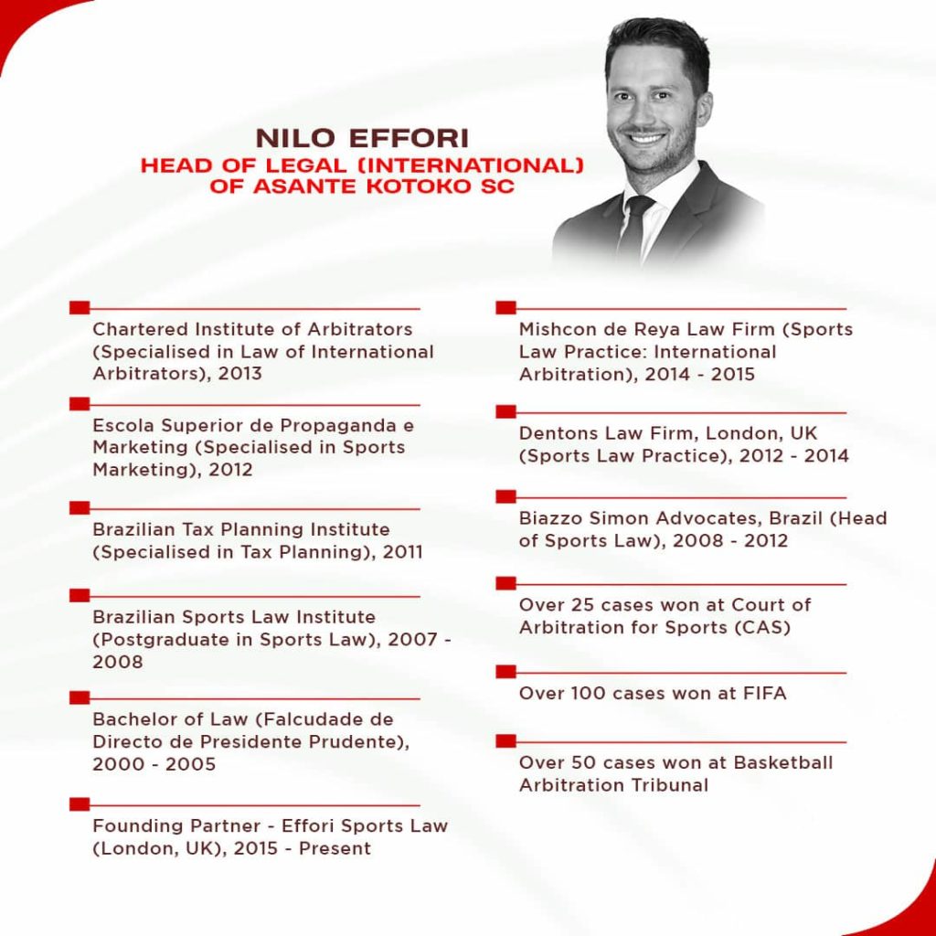 Astute Brazilian legal practitioner, Nilo Aguillar Effori has been appointed as the head of Asante Kotoko international legal affairs.