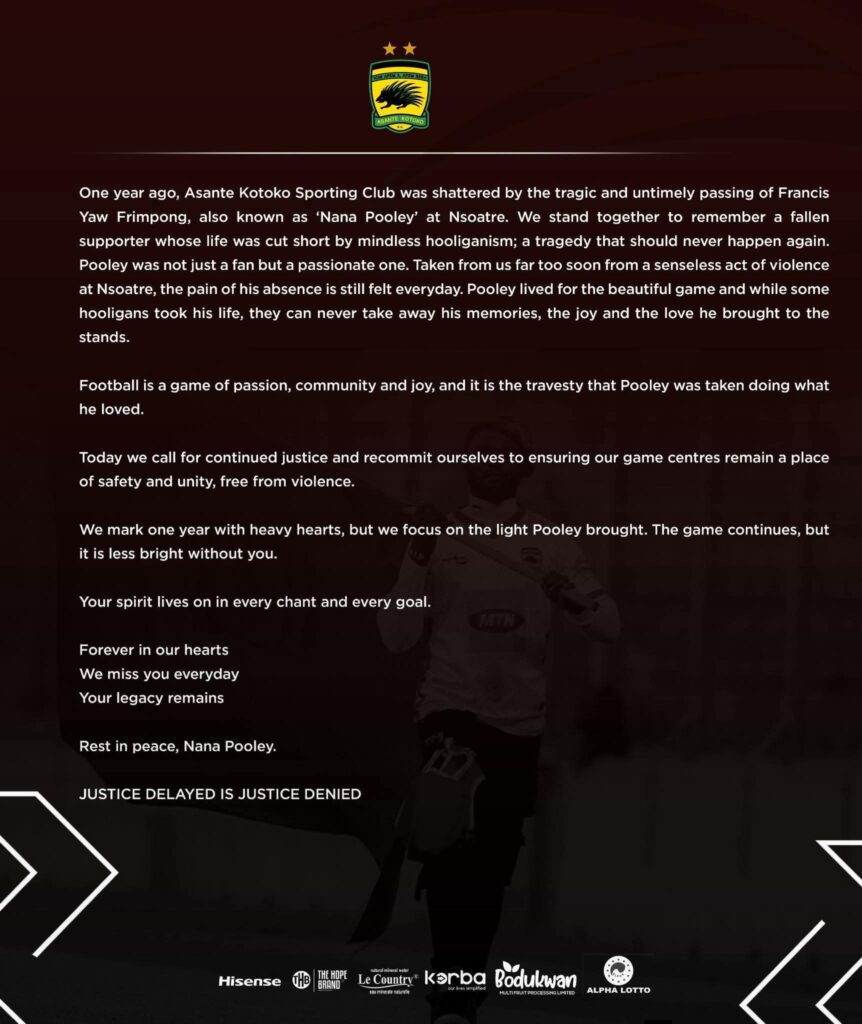 “One year ago, Asante Kotoko Sporting Club was shattered by the tragic and untimely passing of Francis Frimpong also known as Nana Pooley at Nsoatre. We stand together to remember a fallen supporter whose life was cut short by mindless hooligans; a tragedy which should never happen again”.