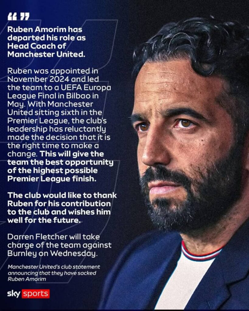 Twenty Times English Premier League (EPL) champions Manchester United have sacked their manager Ruben Amorim for his abysmal output in the 2025/26 football season.