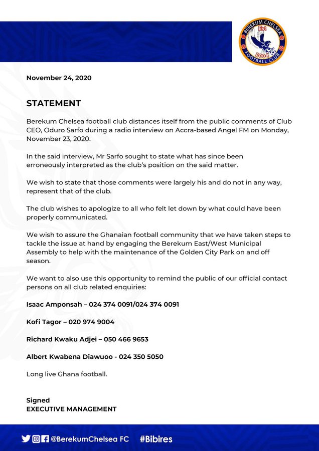 In a swift attempt to distance themselves from Comments by club Chief executive officer Nana Sarfo Oduro in the Media, Berekum Chelsea FC has called on the general public to disassociate the club from contemptuous issues raised in the interview by the Ghana FA executive council member.
