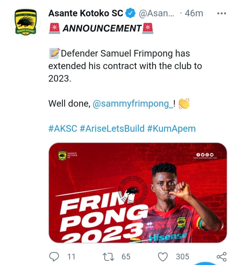 Samuel Frimpong has committed himself to Asante Kotoko SC by signing a new two-year contract with the club.