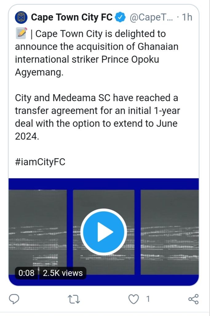 South African top-flight side Cape Town City FC have announced the signing of Medeama SC striker Prince Opoku Agyemang.
