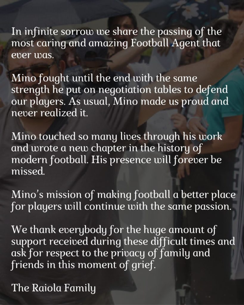 A statement from his family read: “In infinite sorrow, we share the passing of the most caring and amazing football agent that ever was.