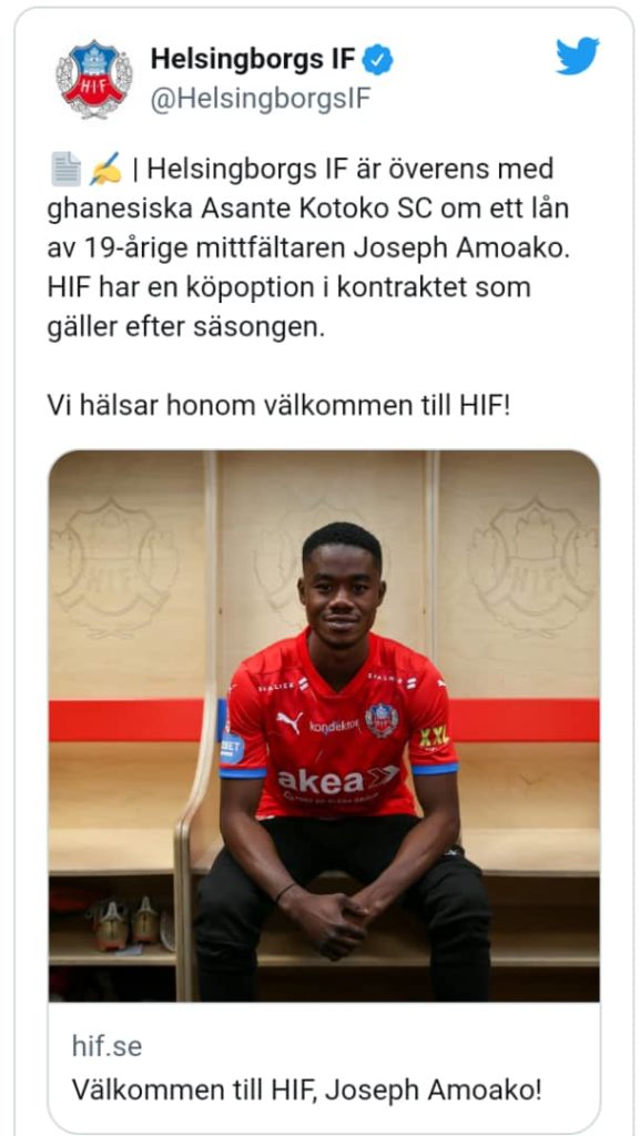 Swedish side Helsingborgs IF have announced the signing of Asante Kotoko youngster Joseph Amoako on loan with a purchase option.