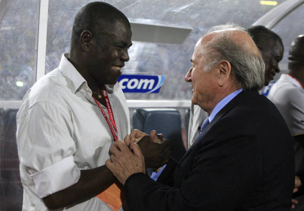 FIFA president Joseph S. Blatter (R) shakes hands with Ghana's head coach Sellas Tetteh (L) before the start of the FIFA U-20 World Cup final football match between Brazil and Ghana in Cairo on October 16, 2009. AFP PHOTO/KHALED DESOUKI (Photo credit should read KHALED DESOUKI/AFP via Getty Images)