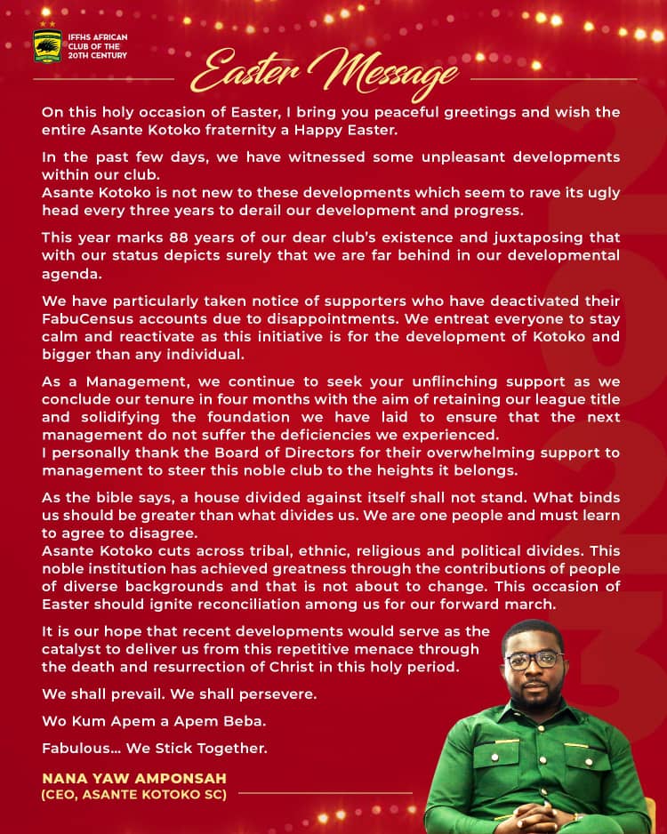 Asante Kotoko CEO Nana Yaw Amposah has implored the club’s followers to focus on the shared values that bring them together in his wonderful Easter message on Friday, April 7,